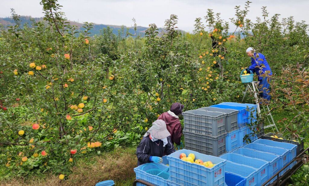 最近、寒くなりました。いよいよ、りんごの収穫シーズン真っ盛りになりました。スタッフは、美味しいりんごを皆様のもとにお届けするため、日々寒さに負けず1つ1つ丁寧に収穫しています。 果物は、朝晩の寒暖差により、より甘く美味し